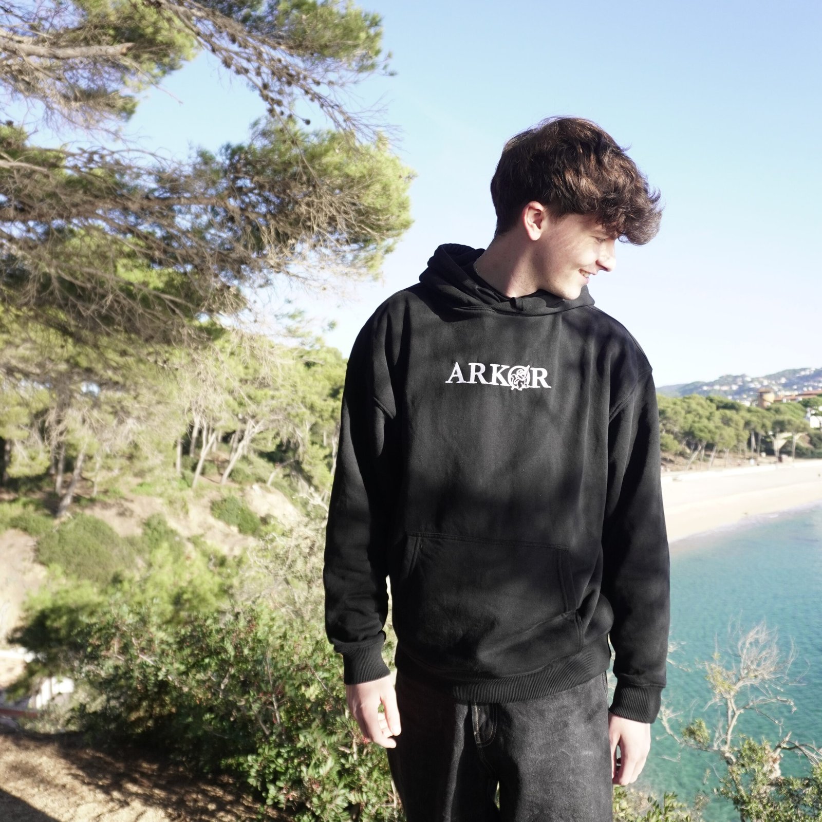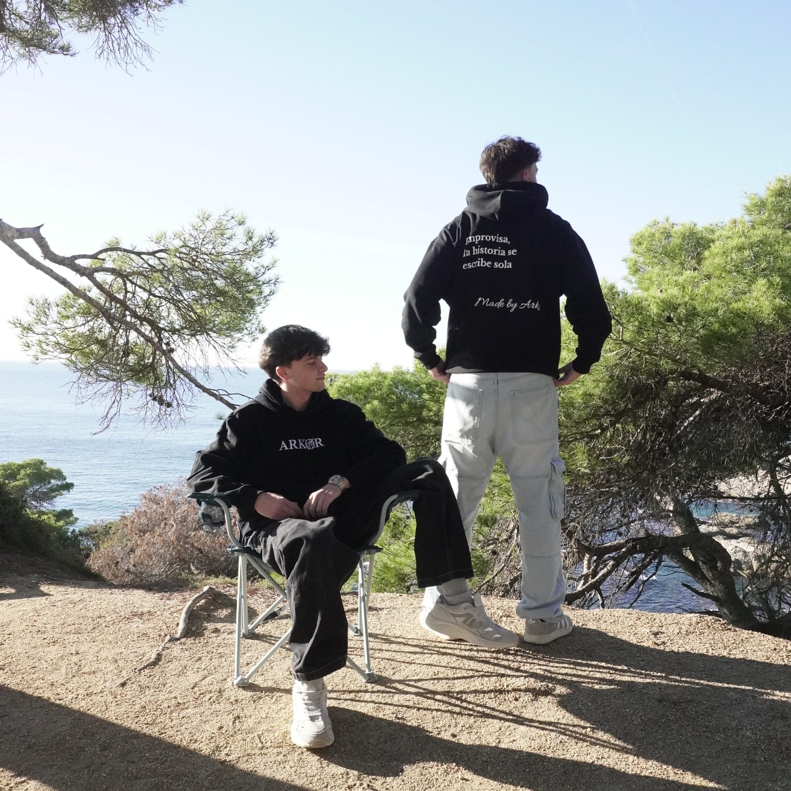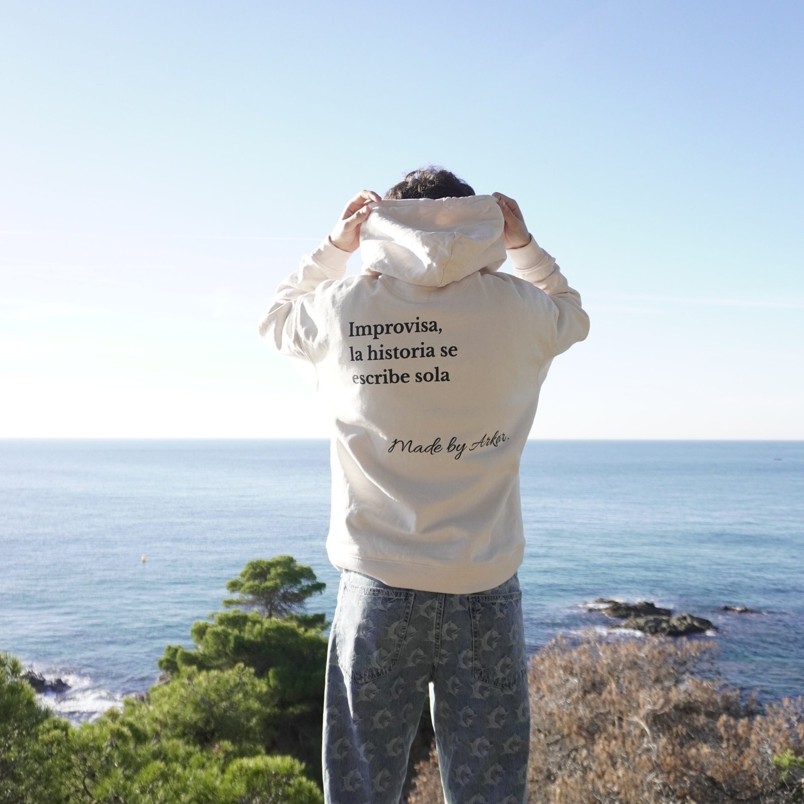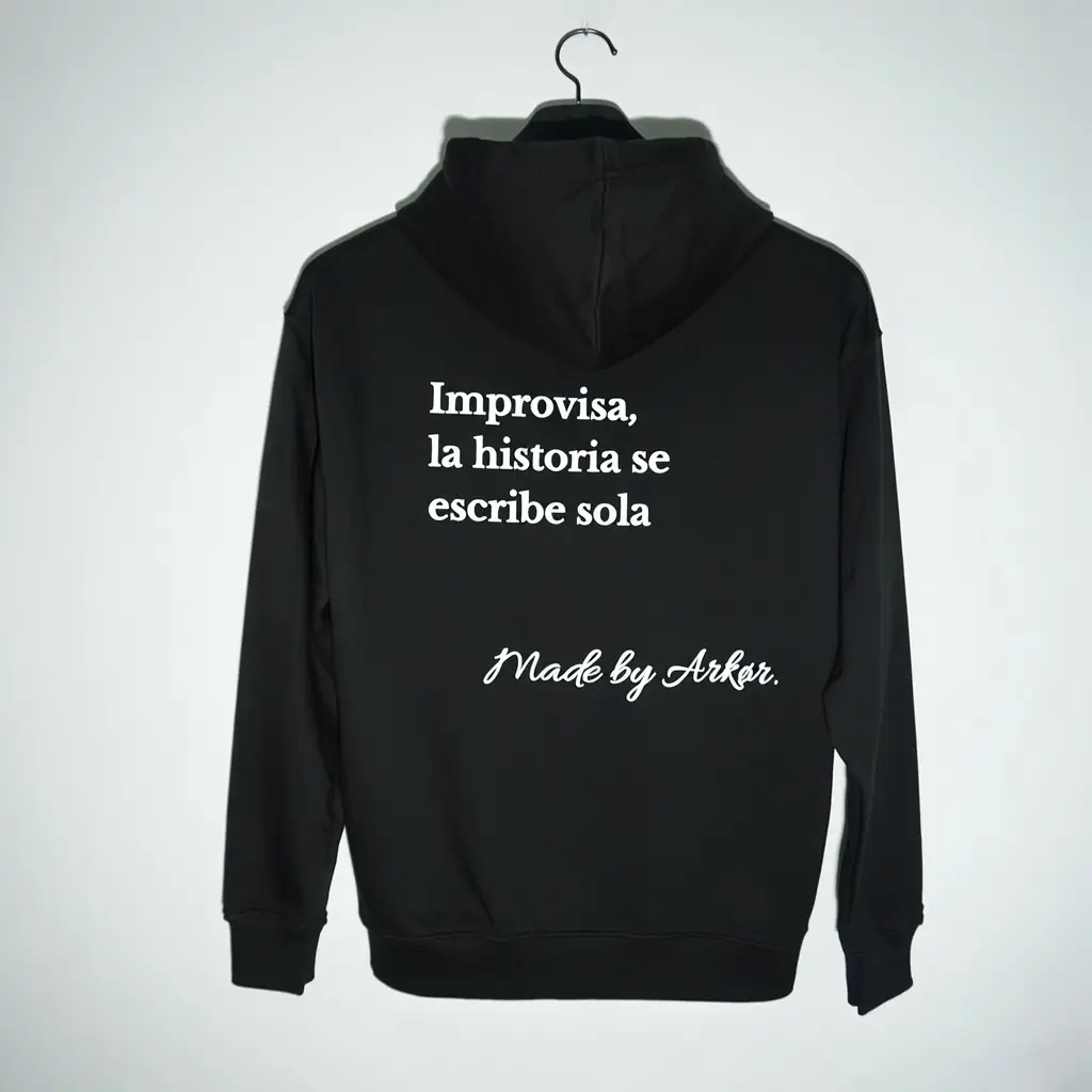 En la parte frontal, un bordado de 7,5×15 cm aporta un acabado limpio y minimalista. En la espalda, una serigrafía de 34×46 cm con el mensaje “Improvisa, la historia se escribe sola” y el sello Made by Arkor refleja la filosofía espontánea y aventurera que define a ARKØR.